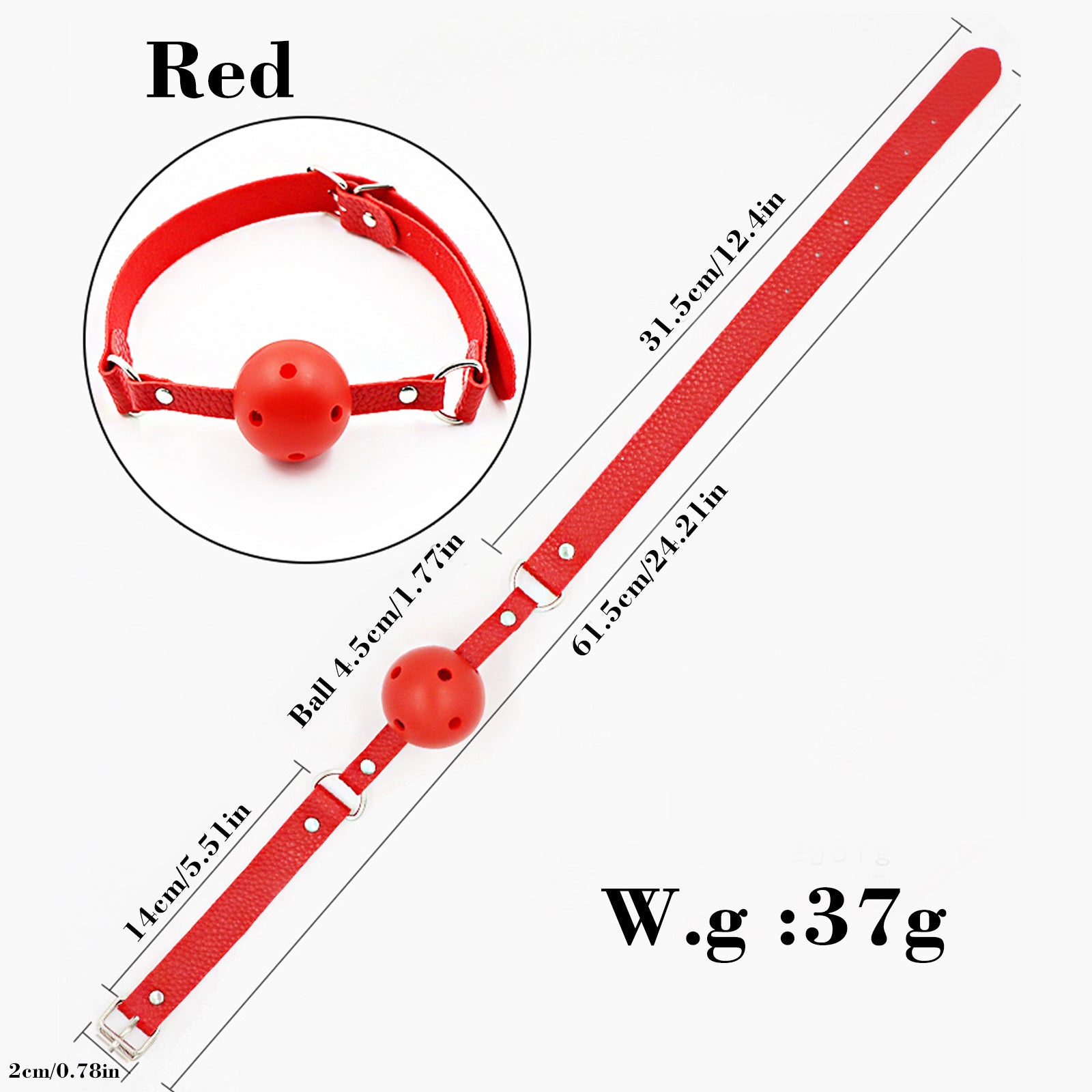 - Mouth ball strap: Total length: 61.5cm/24.21in; Width: 2cm/0.78in; Ball diameter: 4.5cm/1.77in