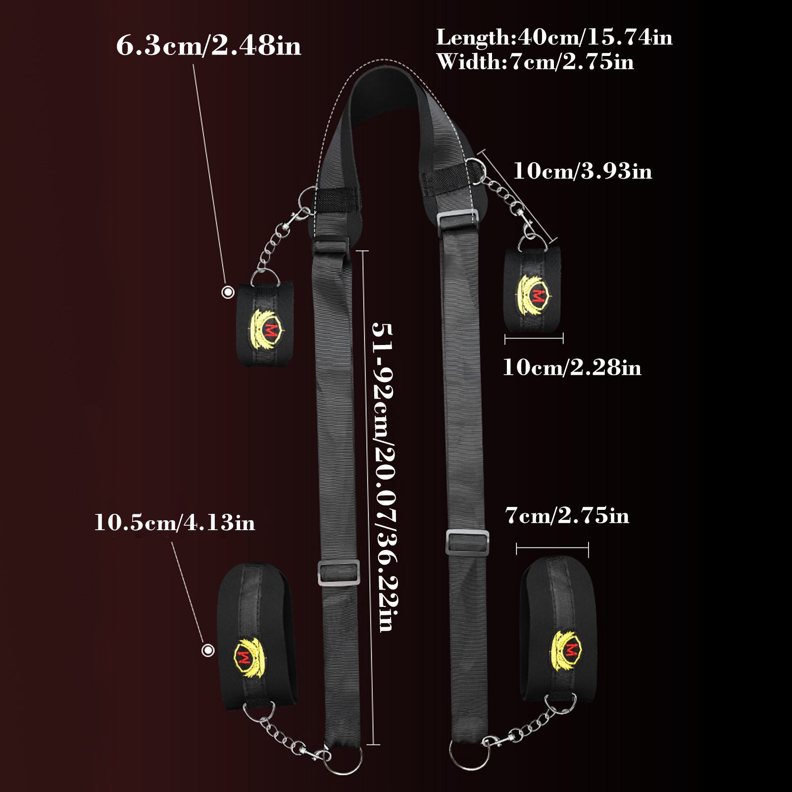 - Split leg straps: Adjustable straps Total length: 131cm/51.57 inches; Width: 7cm/2.75 inches; Handcuffs diameter: 6.3cm/2.48 inches; Handcuffs width: 10cm/3.93 inches; Footcuffs diameter: 10.5cm/4.13 inches; Feet Cuff width: 7cm/2.75 inches