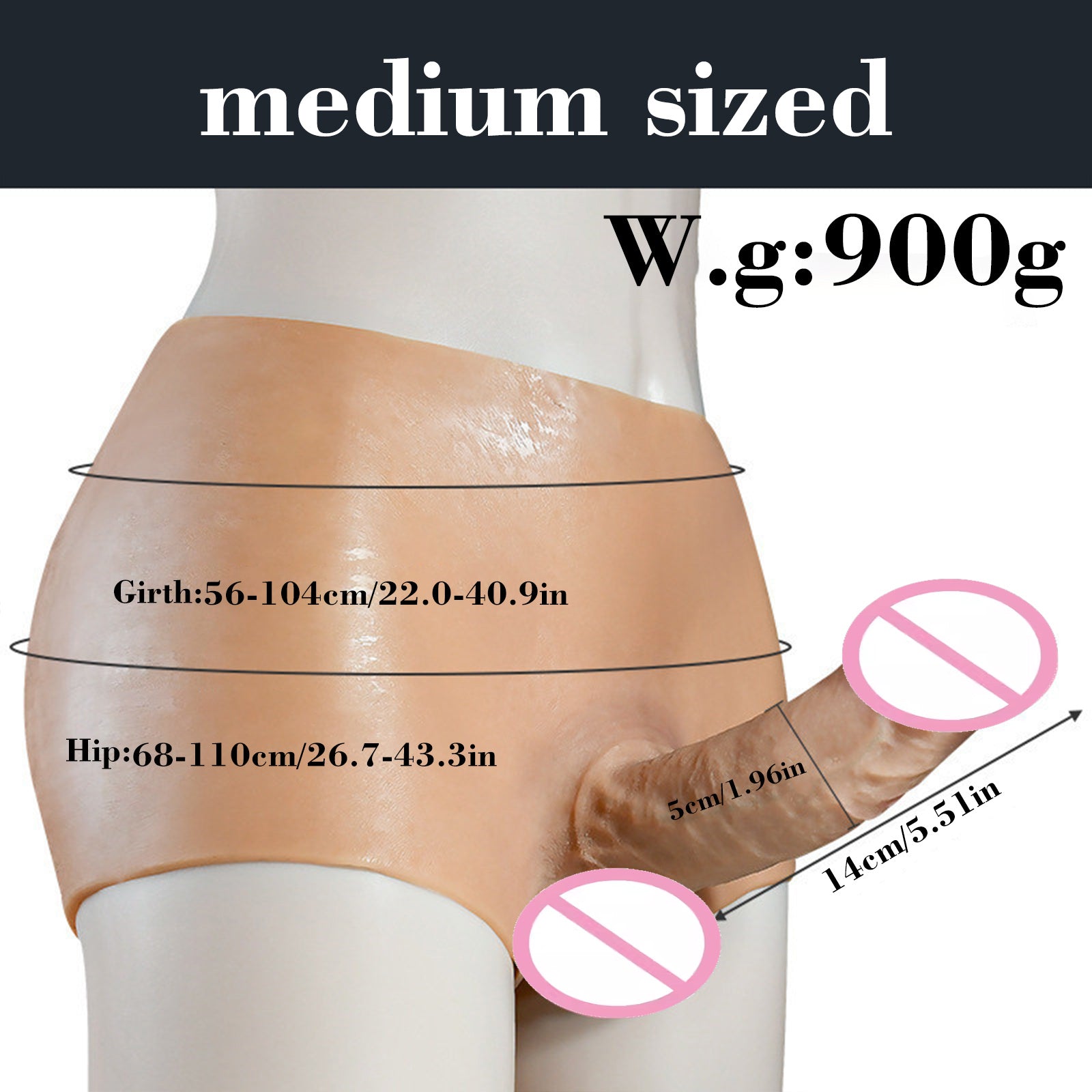 L: Waist: 62-110 cm/24.4-43.3 inches; Hips: 74-116 cm/29.1-45.6 inches; Penis length : 16 cm / 6.29 inches; penis diameter: 3.8 cm / 1.49 inches - Material: liquid silicone